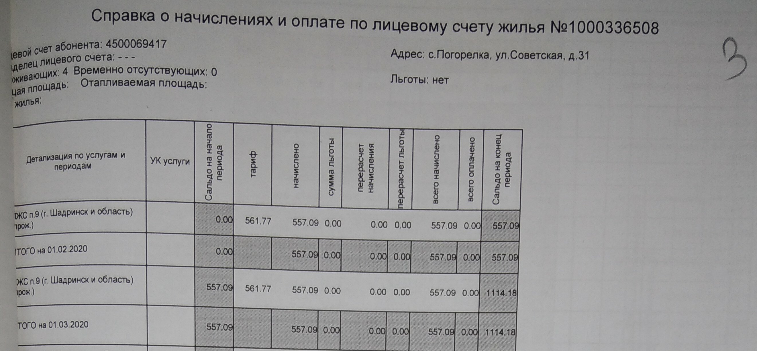 Фото из дела. "Справка о начислениях и оплате... Дело 2-131/2022" Количество проживающих указано 4.
