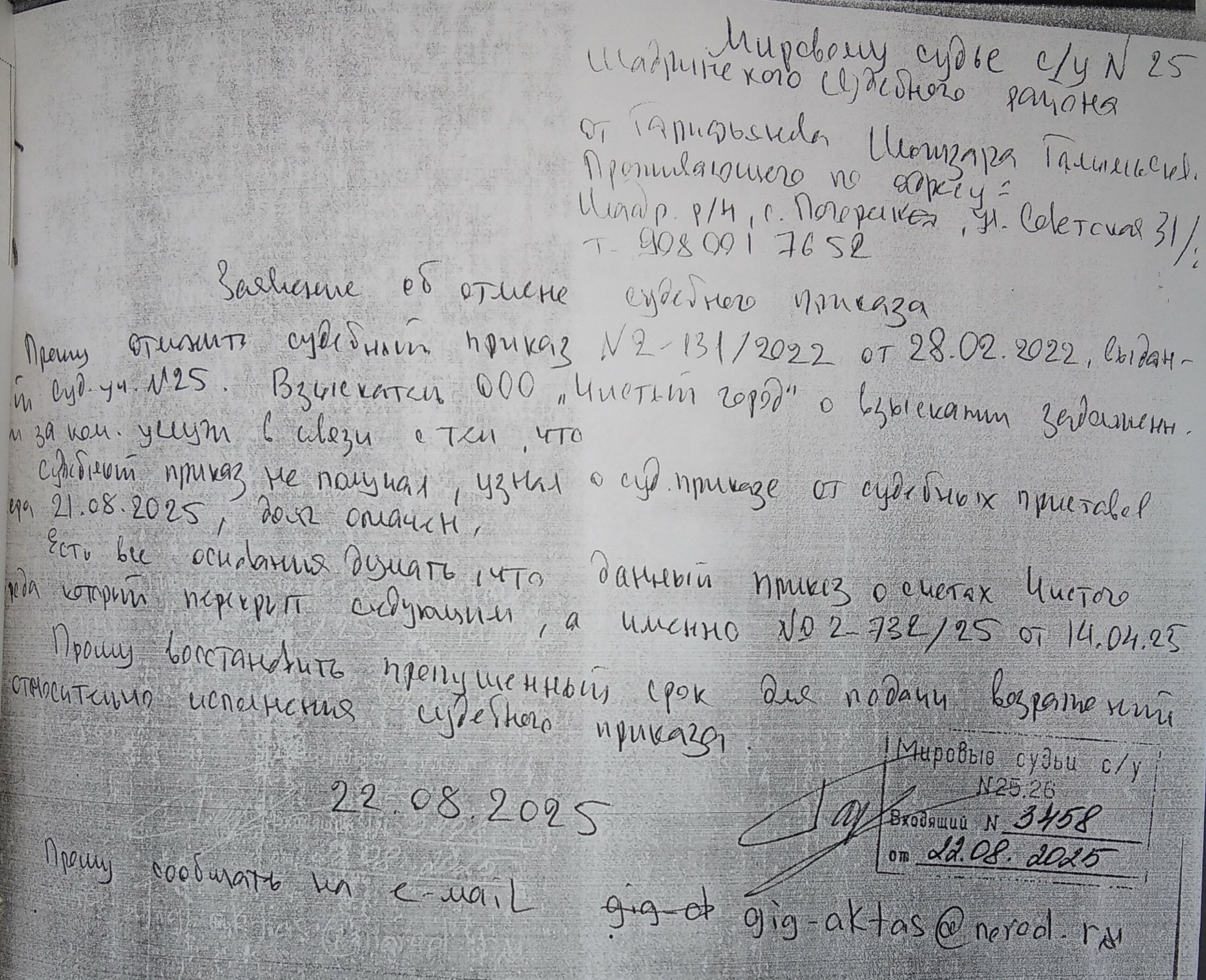 - Попытка отменить судебный приказ по Делу №2-732/2025/25м отвергнута мировым судом г. Шадринска. Дата.